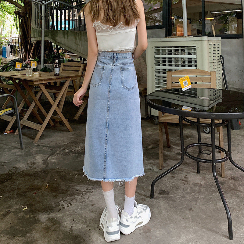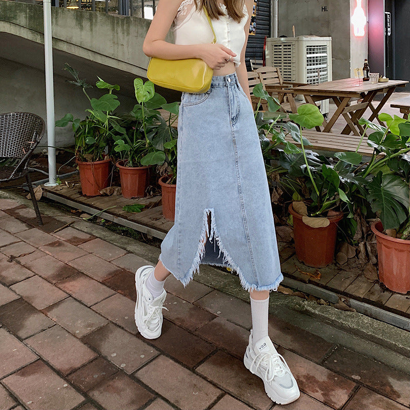 Large Women’s Irregular Denim Skirt Women’s Summer New Mid Length Split Fur Edge Wrap Hip Long Skirt