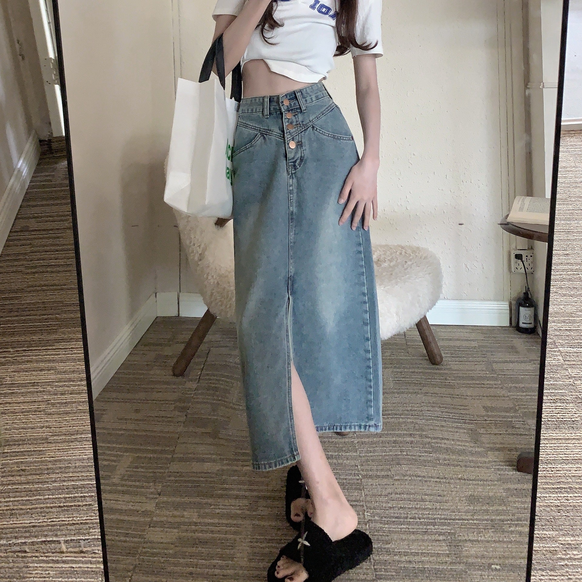 New High Waist Slim Mid Length Split Skirt Temperament Large Retro Denim Skirt Women