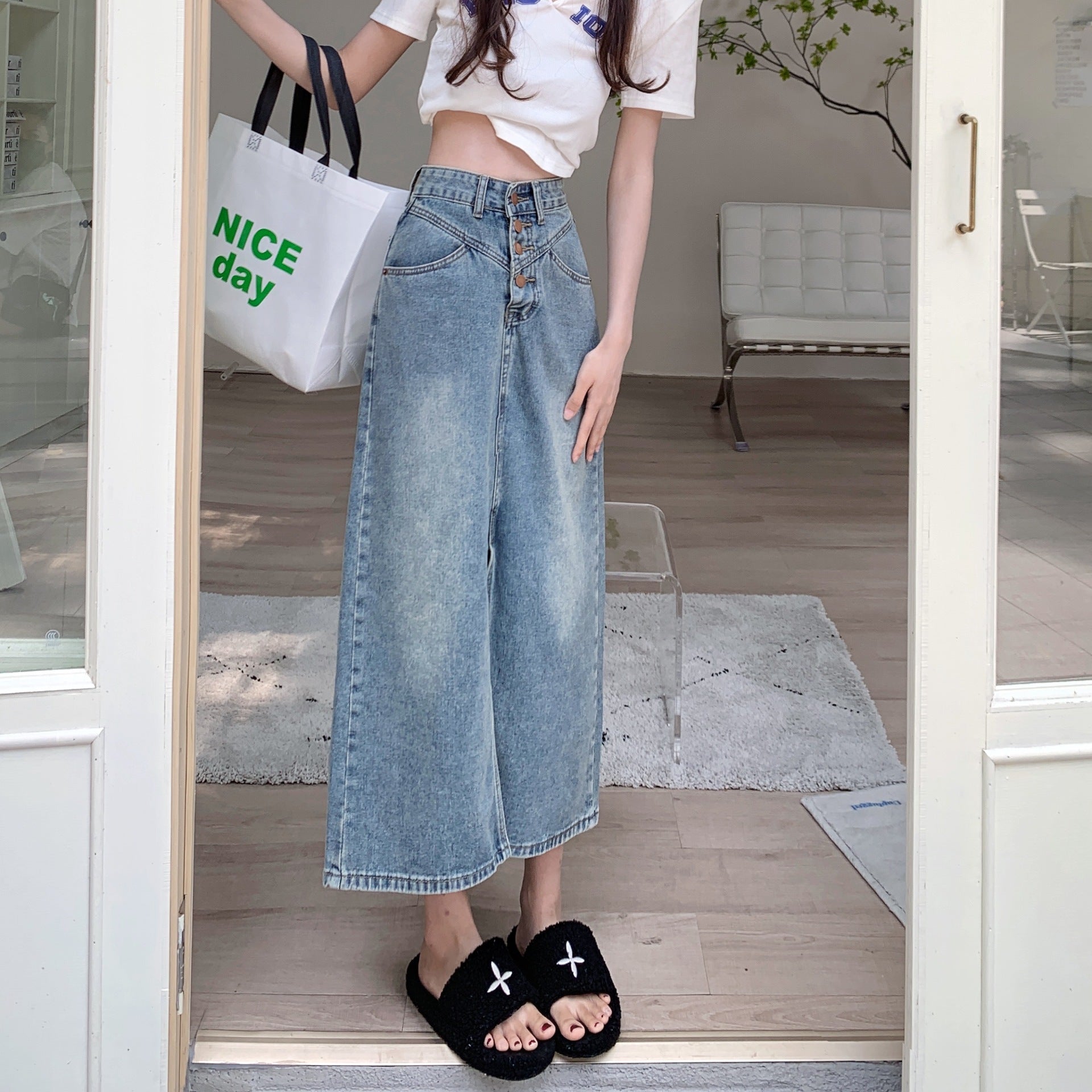 New denim high waist slimming A-line slit