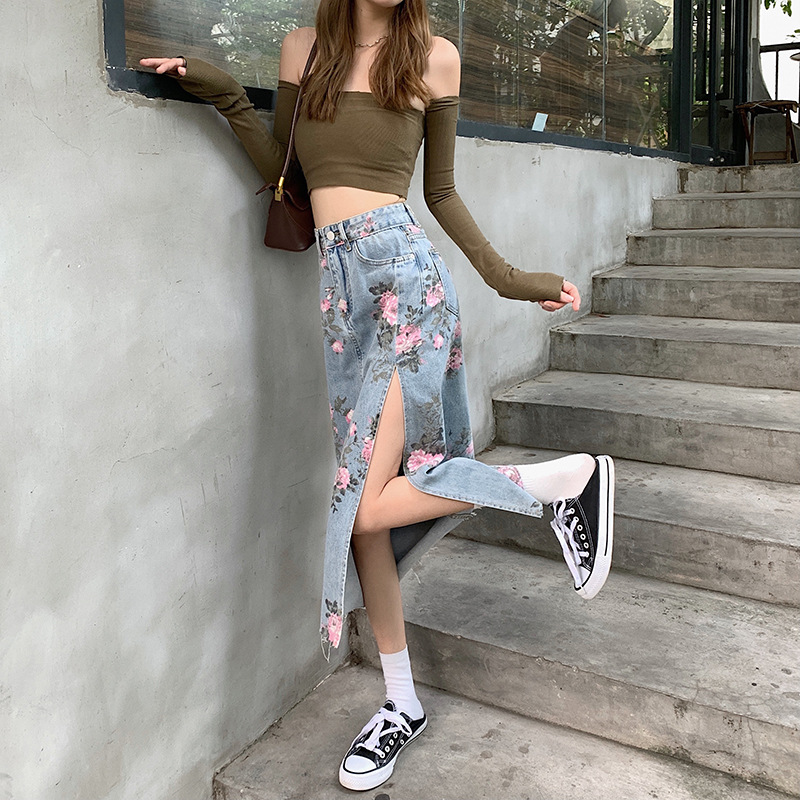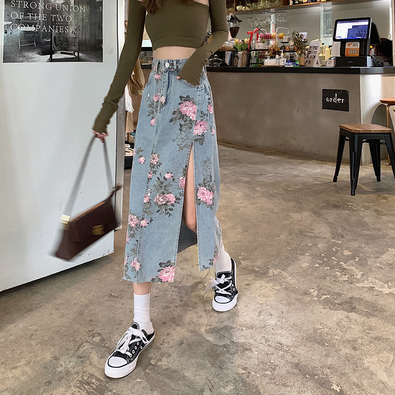 Summer new high waist slimming slit printed denim skirt for women