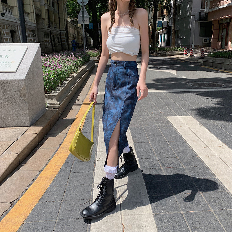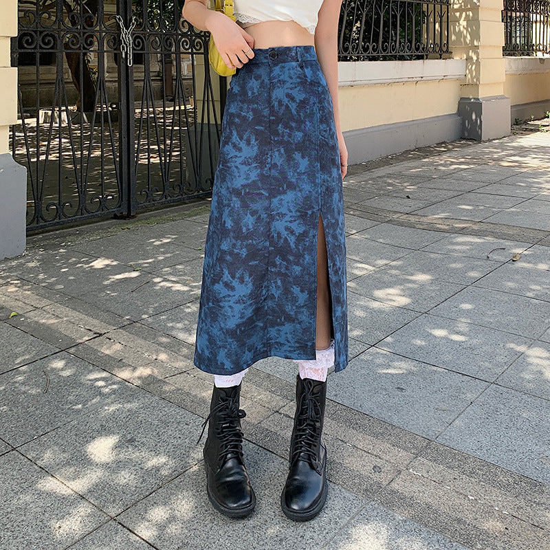 Trendy tie dyed split skirt Women’s summer mid length high waist slim A-line wrap hip skirt
